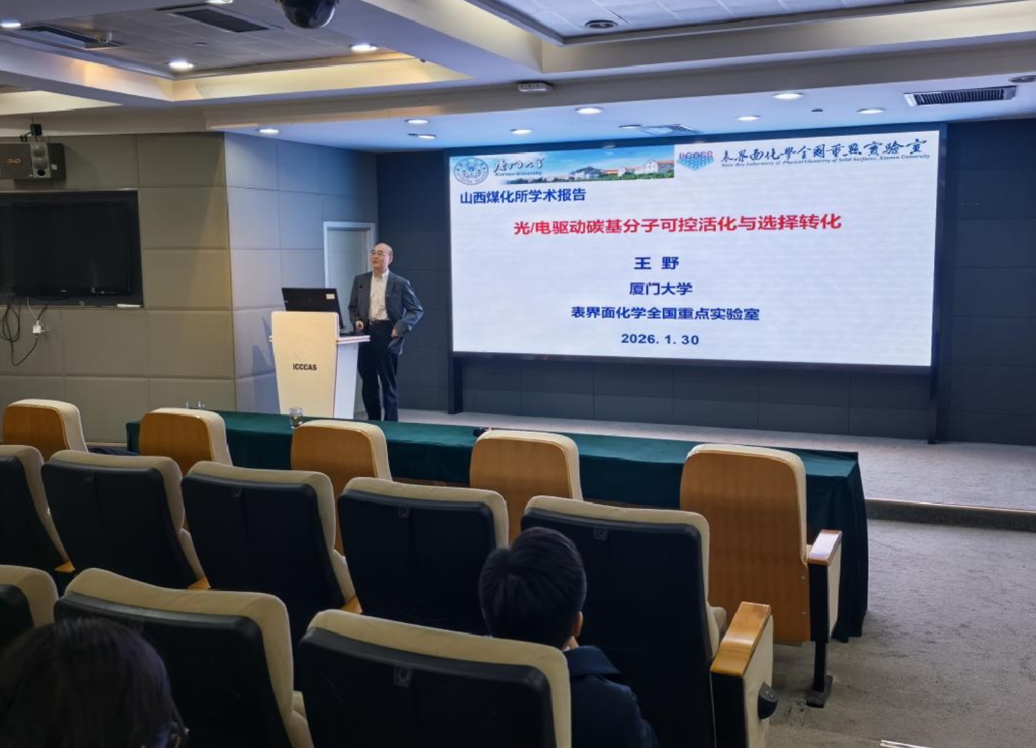 近日,应煤炭高效低碳利用全国重点实验室樊卫斌研究员邀请,厦门大学王野教授来实验室访问交流,并作题为“光/电驱动碳基分子可控活化与选择转化”的学术报告。