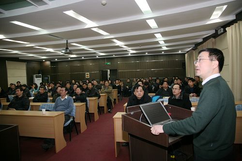 武文斌书记传达了全国人大常委会副委员长、中国科学院院长、党组书记路甬祥在中国科学院2009年度工作会议开幕式上所做的题为“总结过去,规划未来,以科技创新促进科学发展”的讲话及在闭幕式上的总结发言精神,并传达了院党组副书记、常务副院长白春礼代表院党组和院务会议做的大会工作报告。